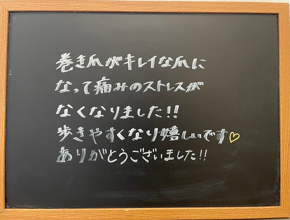 施術も全然痛みもないので巻き爪に悩みのある方は是非治してほしいです!